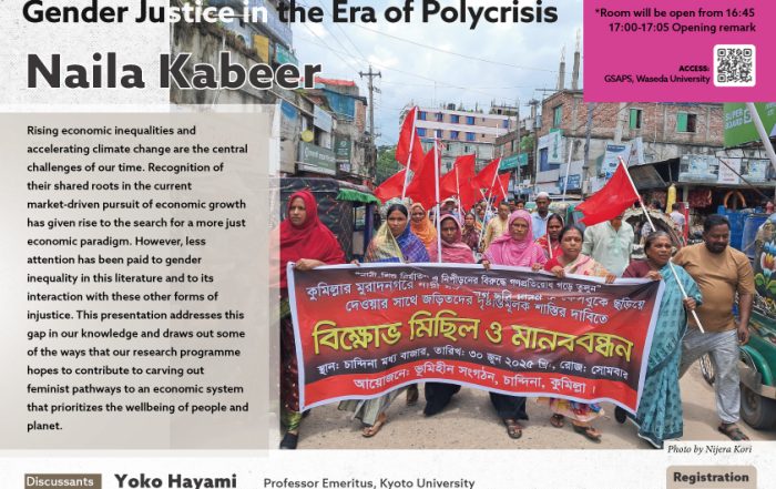 Date & Time: December 4th (Thu) 17:10-19:10 Venue: Graduate School of Asia-Pacific Studies, Waseda University (Waseda campus, Building no.19, Room 711) * Room will be open from 17:00. Access: GSAPS, Waseda University  https://www.waseda.jp/fire/gsaps/access Registration: https://forms.gle/xL6fwdfVkH6J6Rox7 Title: "Renegotiating patriarchy in a challenging environment: Stories of change from Bangladesh" Speaker: Naila Kabeer (Professor  Emeritus, Department of International Development & Faculty of International Inequalities Institute, London School of Economics.) Abstract: What has been described as the ‘Bangladesh Paradox’ in the development literature refers to the remarkable progress made by the country on [...]